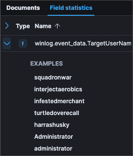 message: 192.168.1.60 and event.code: 4624reveals 8 documents. Examining the contents of the message you will find that6accounts were compromised and successfully logged into. Alternatively the Field statistics can be viewed using the field winlog.event_data.TargetUserName